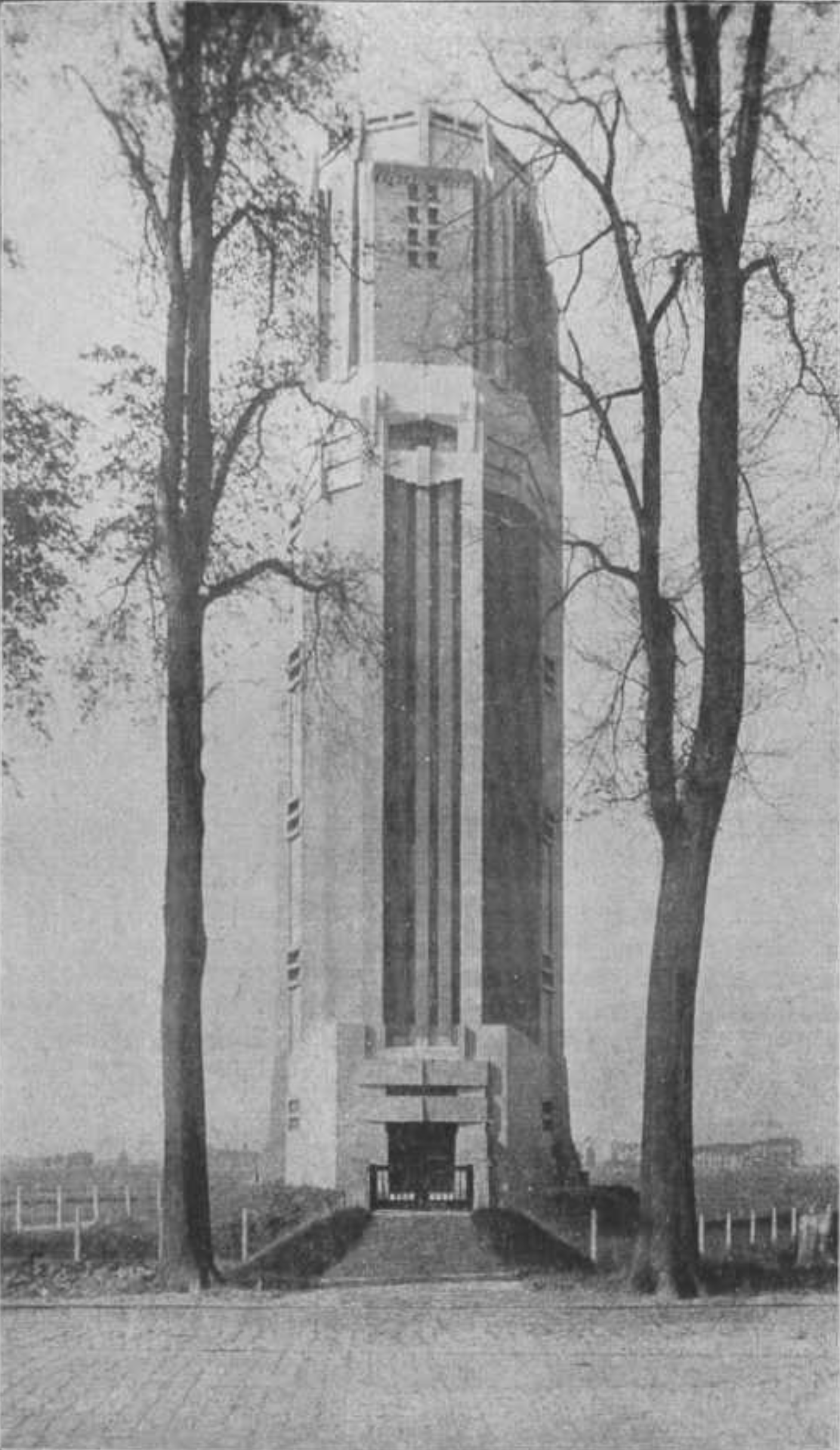 Watertoren te Raamsdonksveer, 1928. Vooraanzicht. Zoals verschenen in "Eenige Watertorens, ontworpen door Ir. H. Sangster" door Prof. Ir. J.G. Wattjes, Bouwbedrijf, pagina 43, 1 februari 1929. Bron: Familiearchief Bart Sangster (kleinzoon van Hendrik Sangster).